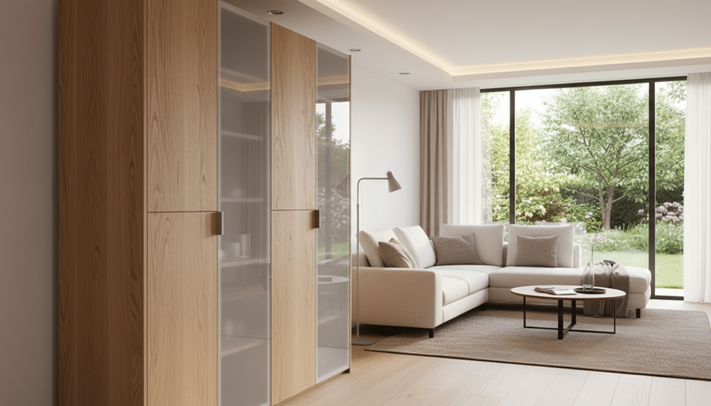 - Glas: Wird häufig für Türen von Vitrinen oder als Akzent im Design verwendet. Glas kann transparent, getönt, satiniert oder mit Mustern versehen sein und lässt Licht durch, was Räume heller wirken lässt.