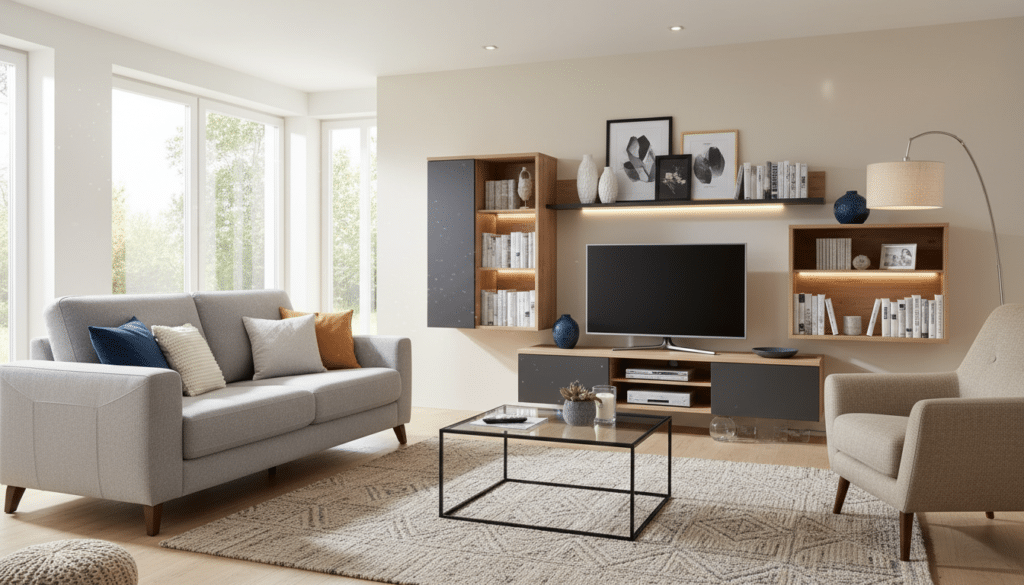 - Modulare Wohnwände: Diese Systeme sind besonders flexibel, da sie aus einzelnen Komponenten bestehen, die Sie individuell zusammenstellen und erweitern können. So passt sich die Wohnwand perfekt an die Größe und Gegebenheiten Ihres Wohnzimmers an.